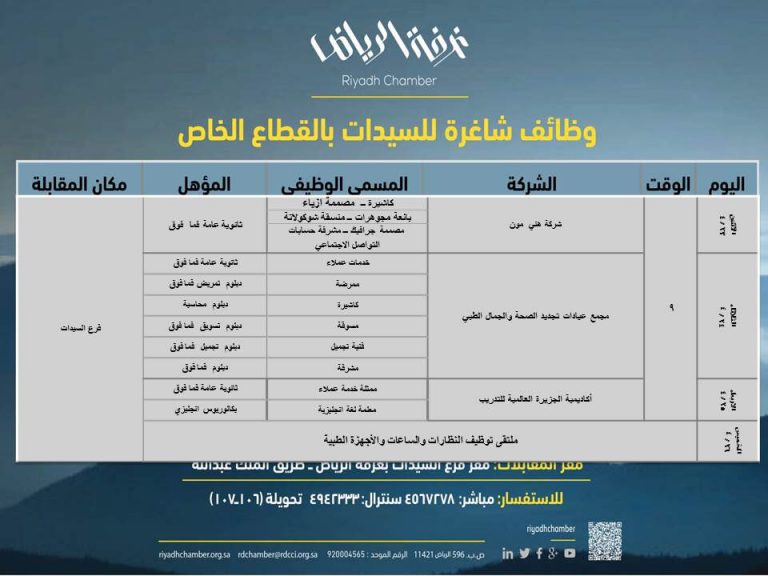 وظائف غرفة الرياض النسائية لهذا الاسبوع